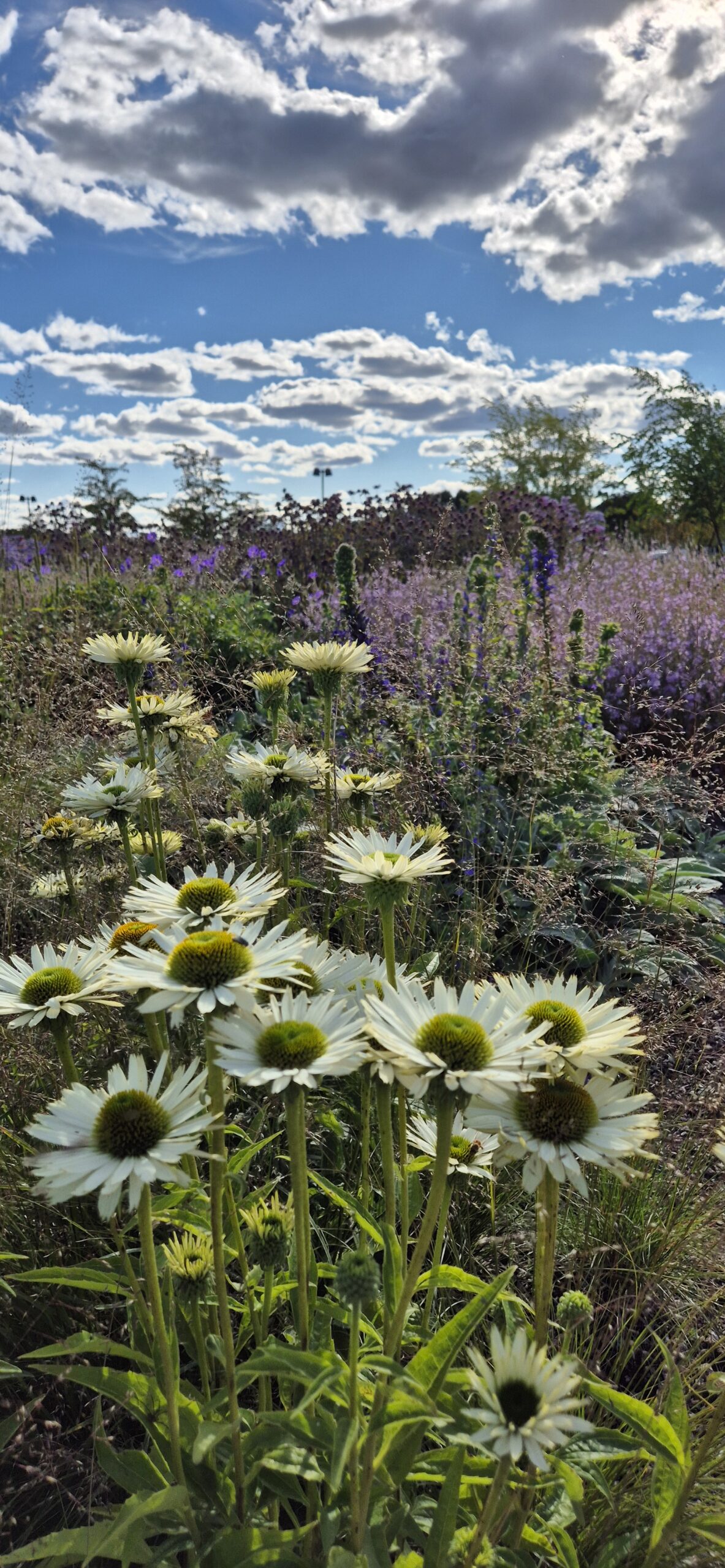 Maar kijk ook verder dan de bloemen: let op de pluimen van de siergrassen die zachtjes wuiven in de wind en de stugge stelen van Echinacea die als architectonische elementen overeind blijven.